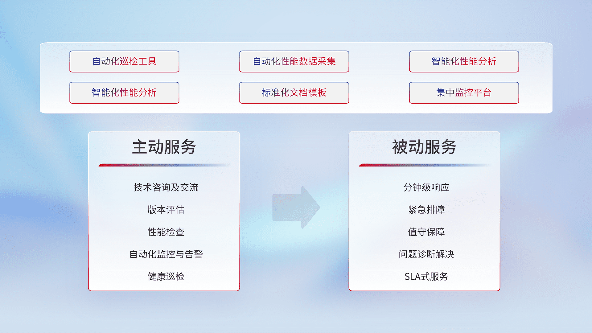 智能化工具和标准化文档,,,,保障服务质量,,,提供主动服务(包含技术咨询、、、、版本评估、、性能检查、、、、自动化监控与告警、、、健康巡检)和被动服务包含(分钟级响应、、紧急排障、、、值守保障、、、问题诊断解决、、、SLA服务)。。